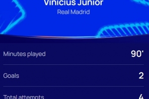 本場比賽維尼修斯梅開二度,4次射門,最快速度32km/h,跑動距離7.9km,賽后他也當(dāng)選歐冠官方評選出的本場最佳球員。