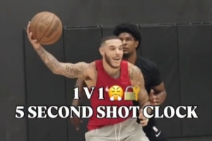 訓(xùn)練師曬騎士后衛(wèi)朗佐-鮑爾、開拓者后衛(wèi)斯庫特-亨德森,以及另一位職業(yè)球員Milan Acquaah的單挑訓(xùn)練視頻,進(jìn)攻時(shí)間限時(shí)5秒。