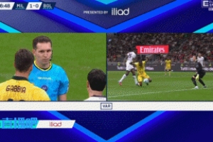 比賽第86分鐘,米蘭前鋒恩昆庫在禁區(qū)內(nèi)被博洛尼亞后衛(wèi)盧庫米推倒,恩昆庫起身后護球時和另一名博洛尼亞后衛(wèi)弗魯勒對抗時再次倒地。主裁判先是判罰點球,隨后VAR介入,主裁判觀看視頻回放后取消了點球,米蘭主帥阿萊格里因不滿判罰還吃到紅牌。