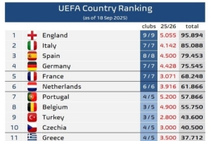 體育資訊9月19日訊 歐冠聯(lián)賽階段首輪已經(jīng)完賽,相關(guān)機構(gòu)也統(tǒng)計了本賽季的歐戰(zhàn)積分情況,并更新了歐足聯(lián)旗下各協(xié)會的積分排名。英格蘭依然獨自領(lǐng)跑,而意大利第二的位置仍暫時牢固,但領(lǐng)先優(yōu)勢有略微縮小。