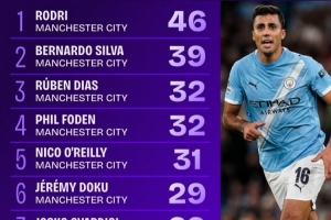 體育資訊9月19日訊 著名數(shù)據(jù)網(wǎng)站Squawka統(tǒng)計(jì)了歐冠首輪進(jìn)攻三區(qū)傳球數(shù)據(jù),羅德里46次居首,曼城球員包攬前十。