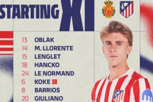 馬競(jìng)首發(fā):13-奧布拉克、14-馬科斯-略倫特、15-朗格萊、18-漢茨科、24-勒諾爾芒、6-科克、8-巴勃羅-巴里奧斯、20-朱利亞諾-西蒙尼、23-尼古拉斯-岡薩雷斯、19-阿爾瓦雷斯、22-拉斯帕多里