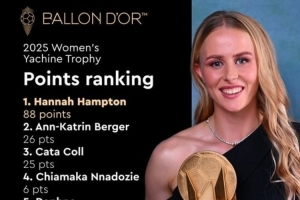 體育資訊9月28日訊 《法國足球》公布了2025年首屆女足雅辛獎(jiǎng)的投票結(jié)果,英格蘭國家隊(duì)兼切爾西門將漢娜-漢普頓以壓倒性優(yōu)勢歷史性地奪得該獎(jiǎng)項(xiàng)。