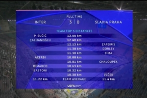 本場比賽國米方面跑動距離最多的是蘇西奇的12.66km,其次為恰爾汗奧盧12.40km,之后分別是阿切爾比10.88km,迪馬爾科10.63km,巴斯托尼10.32km。