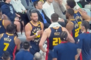 在本場比賽中,庫里和新秀中鋒波斯特在場邊積極溝通。