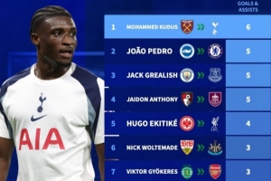 體育資訊10月9日訊 德國(guó)轉(zhuǎn)會(huì)市場(chǎng)盤點(diǎn)了英超新援參與進(jìn)球數(shù)據(jù),庫杜斯參與6球排名第一。