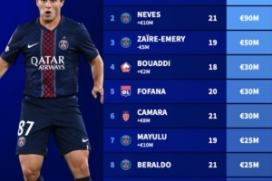 法甲U21球員身價榜:杜埃、若昂-內維斯9000萬歐并列榜首