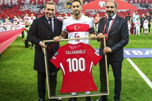 恰爾汗奧盧在對(duì)陣保加利亞的比賽中達(dá)成國家隊(duì)出戰(zhàn)100場(chǎng)里程碑,此役賽前土耳其隊(duì)向他頒發(fā)了紀(jì)念球衣。