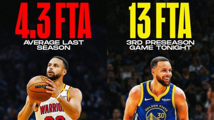 對(duì)陣開拓者的第三場(chǎng)季前賽中,庫(kù)里獲得了13次罰球機(jī)會(huì)。盡管他上賽季場(chǎng)均突破次數(shù)位列聯(lián)盟前15,但其場(chǎng)均罰球數(shù)僅為4.3次。