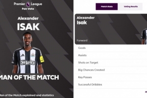 賽后,英超官方宣布,本場(chǎng)比賽中打進(jìn)2球的伊薩克當(dāng)選全場(chǎng)最佳球員。