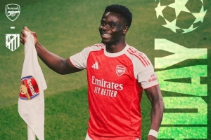 賽前,阿森納官方曬出海報,為本場比賽預(yù)熱。薩卡單人出鏡,海報左上角為對陣雙方隊徽,右上角為歐冠標(biāo)志。