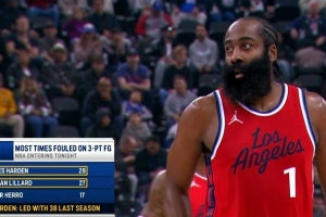 比賽中轉(zhuǎn)播方曬出數(shù)據(jù),本賽季三分線外被犯規(guī)的前3名分別為:哈登28次、利拉德27次、希羅17次。