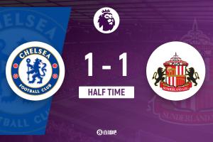 上半場傷停補時3分鐘,半場結束,切爾西暫1-1桑德蘭。