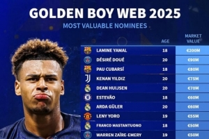 體育資訊10月29日訊 金童獎在本月已經(jīng)公布了候選名單,《轉(zhuǎn)會市場》也統(tǒng)計了今年候選者的身價情況,亞馬爾無懸念居首。