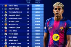 體育資訊10月29日訊 德轉(zhuǎn)盤點了歷史上身價最高的30名球員,歷史上共有四名球員達到過2億歐元里程碑,分別是亞馬爾(2025年,17歲)、姆巴佩(2018年,19歲)、維尼修斯(2024年,24歲)和哈蘭德(2024年,24歲)。