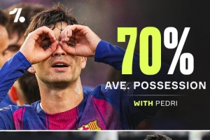 Onefootball統(tǒng)計(jì)了佩德里本賽季在場和缺陣時巴薩的控球率。佩德里本賽季出場時巴薩平均控球率70%,他缺席時巴薩平均控球率為50%,降低20%。
