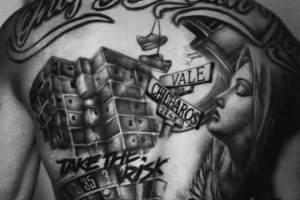 萊奧紋身的右側(cè)是圣母瑪利亞的頭像,左側(cè)是他從小生活的街區(qū)圖,中間還有兩塊路標,上面寫著萊奧家鄉(xiāng)塞圖巴爾區(qū)的郵編2845。紋身的左下方是一句口號“冒險”,旁邊是輪盤賭和四張A撲克牌。