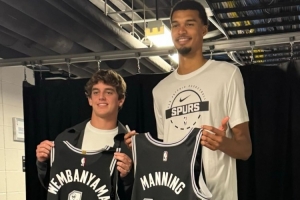 本場比賽,德克薩斯大學橄欖球隊球員阿奇·曼寧等人現(xiàn)場觀看了本場比賽,并受到了文班亞馬及??怂沟慕哟P侨⑵妗ぢ鼘庍€和文班互換了球衣。