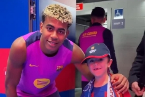 體育資訊11月11日訊 巴薩上周五在諾坎普進(jìn)行了公開訓(xùn)練,阿勞霍帶著一位患病小球迷見亞馬爾。