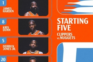 賽前快船公布了本場首發(fā):哈登、鄧恩、小德里克·瓊斯、科林斯、祖巴茨。