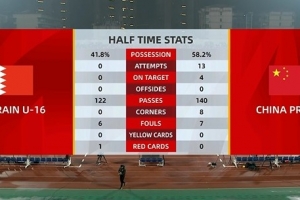 體育資訊11月22日訊 U17亞預(yù)賽第一輪,國少隊半場3-0領(lǐng)先巴林隊,數(shù)據(jù)方面,國少隊半場13射4正3進球,對手0射門。