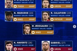 體育資訊11月23日訊 阿森納將在本輪英超焦點(diǎn)戰(zhàn)對(duì)陣熱刺,《轉(zhuǎn)會(huì)市場(chǎng)》統(tǒng)計(jì)顯示隊(duì)內(nèi)最多可能有8人無(wú)法出戰(zhàn)。