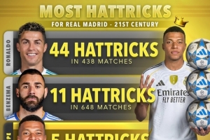 體育資訊11月29日訊 Score90統(tǒng)計了本世紀球員在皇馬上演帽子戲法的次數(shù),并列出榜單,C羅44次居首,本澤馬11次第二,姆巴佩5次。