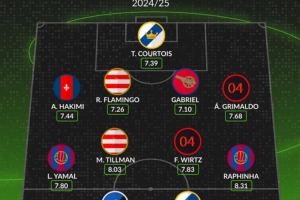 后衛(wèi):阿什拉夫(巴黎,7.44分)、弗拉明戈(埃因霍溫,7.26分)、加布里埃爾(阿森納,7.10分)、格里馬爾多(勒沃庫森,7.68分)