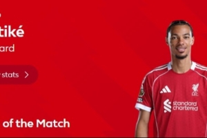據(jù)賽后英超官方消息,利物浦前鋒?;倏吮辉u選為此役最佳球員。
