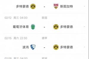 多特2月8日22點30分在德甲主場對陣斯圖加特,2月12日4點歐冠淘汰賽附加賽首回合客場對陣葡萄牙體育,2月19日4點次回合主場對陣葡萄牙體育。