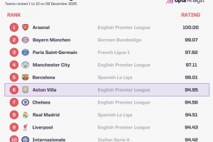 體育資訊12月9日訊 Opta列出了全球俱樂部競(jìng)技實(shí)力實(shí)時(shí)排名,阿森納居首,拜仁、巴黎二三位,維拉升至第6位。