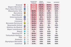 體育資訊12月9日訊 本賽季歐冠聯(lián)賽階段第6輪的比賽即將開打,opta在當(dāng)?shù)貢r間12月9日對本賽季歐冠的形勢進行了新一輪預(yù)測,阿森納奪冠概率22.6%最高,拜仁、巴黎排在二三位。