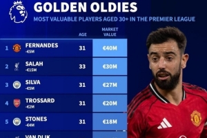 體育資訊12月10日訊 德國(guó)轉(zhuǎn)會(huì)市場(chǎng)統(tǒng)計(jì)了英超30歲以上球員身價(jià)排名,曼聯(lián)隊(duì)長(zhǎng)布魯諾·費(fèi)爾南德斯排名第一。