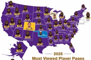 BBR曬2023年各州被瀏覽次數(shù)最多球員:詹姆斯在41個州處于領先地位