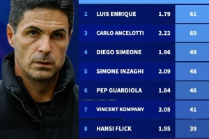 自阿爾特塔歐冠首秀主帥積分榜:阿爾特塔居首,恩里克次席
