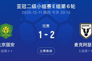 體育資訊12月11日訊 亞冠二級小組賽E組第6輪,北京國安1-2輸給麥克阿瑟FC。本輪中超球隊亞冠賽場表現(xiàn),海港、蓉城戰(zhàn)平,國安、申花失利。