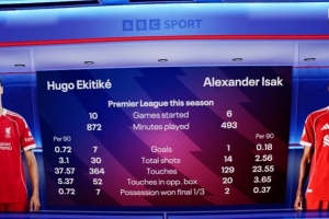 以下為利物浦兩大鋒線新援埃基蒂克、伊薩克本賽季英超數(shù)據(jù)對比,具體如下(括號內(nèi)為每90分鐘數(shù)據(jù)):