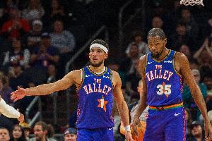 本場比賽,杜蘭特全場出戰(zhàn)29分鐘,13投6中,三分9投5中,罰球4罰2中,得到19分6籃板3助攻1搶斷1蓋帽。本場比賽,布克全場出戰(zhàn)34分鐘,23投12中,三分11投5中,罰球3罰2中,得到31分5籃板11助攻1搶斷。