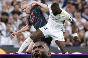 23/24賽季歐冠1/4決賽首回合,皇馬3-3曼城,哈蘭德打滿全場1射1正0進球