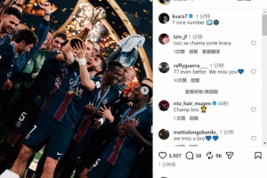 在巴黎身披7號的克瓦拉茨赫利亞社媒曬出捧杯照片,慶祝球隊(duì)奪冠,配文:“7是不錯的數(shù)字?!?/p>