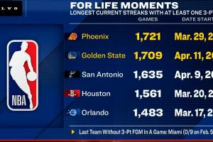 NBA球隊上一次出現(xiàn)全場沒進(jìn)三分的情況還是在2016年2月6日(當(dāng)?shù)貢r間2月5日),該場比賽熱火全隊三分9中0。