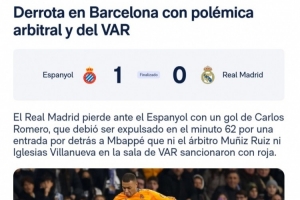 皇馬因為卡洛斯-羅梅羅的進球輸給了西班牙人,而羅梅羅本應(yīng)在第62分鐘因背后鏟倒姆巴佩被罰下場,但主裁判穆尼茲-魯伊斯和VAR室的伊格萊西亞斯-比利亞努埃瓦都沒有給他紅牌。