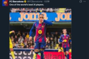 本場比賽后,巴薩官方社媒賬號曬出了拉菲尼亞的賽場照,并配文:“世界上最好的11個球員之一。”