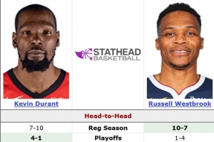 在本場比賽之前,杜蘭特和威少常規(guī)賽相遇17場,杜蘭特7勝10負;季后賽相遇5場,杜蘭特4勝1負。