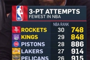 火箭客場挑戰(zhàn)國王,轉(zhuǎn)播方給出統(tǒng)計(jì),本場比賽之前,火箭本賽季三分出手748次聯(lián)盟倒數(shù)第一,國王848次倒數(shù)第二。