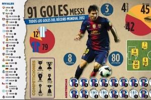 2012年12月22日,梅西在巴薩3-1巴拉多利德的比賽中破門,打進自己在2012年的第91球,以69場91球的數(shù)據(jù)超過蓋德-穆勒6球,刷新足壇歷史自然年進球紀錄。在那年的比賽中,梅西還送出了24次助攻。