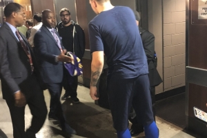 湖記Dave McMenamin更推曬照:“這些模糊的照片拍攝于2018年11月1日,菜鳥賽季的東契奇首次打完湖人后索要詹姆斯球衣,隨后東契奇前往湖人更衣室從保安手中拿到了球衣。”
