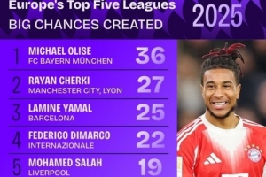 體育資訊12月31日訊 2025年即將結(jié)束,數(shù)據(jù)機構(gòu)squawka也統(tǒng)計了本年度五大聯(lián)賽創(chuàng)造重大機會情況,奧利塞獨自領(lǐng)跑。