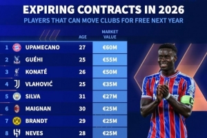 體育資訊1月2日訊 2026年已經(jīng)到來,多位知名球員將在今夏合同到期,《轉(zhuǎn)會市場》也統(tǒng)計了今夏合同到期球員的最貴身價榜,三大中衛(wèi)包攬前三。
