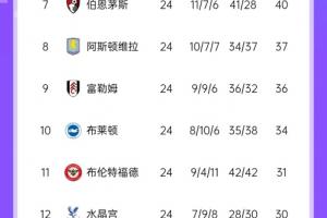 最新英超積分榜形勢如圖: